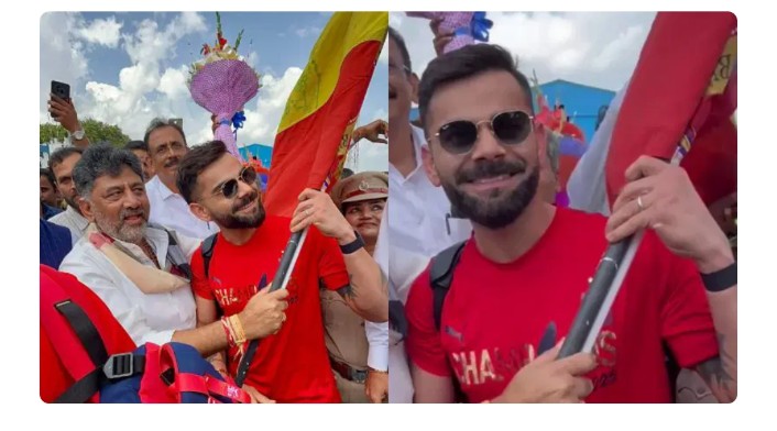 ಆರ್ಸಿಬಿ ತಂಡದ ಆಟಗಾರರಿಗೆ ಹೆಎಎಲ್ ವಿಮಾನ ನಿಲ್ದಾಣದಲ್ಲಿ ಡಿಸಿಎಂ ಡಿ.ಕೆ.ಶಿವಕುಮಾರ್ (D.K.Shivakumar) ಸ್ವಾಗತ ಕೋರಿದರು. ಈ ವೇಳೆ, ಆರ್ಸಿಬಿ ಸ್ಟಾರ್ ವಿರಾಟ್ ಕೊಹ್ಲಿಗೆ (Virat Kohli) ಕನ್ನಡದ ಬಾವುಟ ನೀಡಿದರು. ಕನ್ನಡ ಧ್ವಜ ಹಾರಿಸುವ ಮೂಲಕ ವಿರಾಟ್ ಖುಷಿಪಟ್ಟರು.