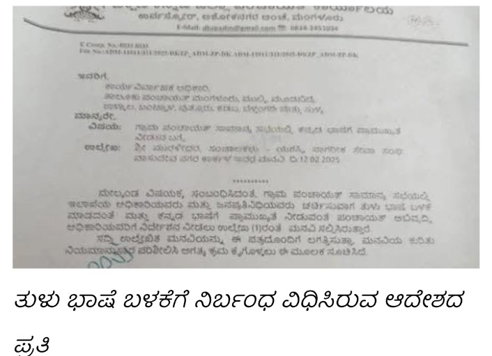 ಈ ಆದೇಶದಲ್ಲಿ, ಗ್ರಾಮ ಪಂಚಾಯತ್ ಸಾಮಾನ್ಯ ಸಭೆಯಲ್ಲಿ ಇಲಾಖೆಯ ಅಧಿಕಾರಿಗಳು ಮತ್ತು ಜನಪ್ರತಿನಿಧಿಗಳು ಚರ್ಚಿಸುವಾಗ ತುಳು ಭಾಷೆ ಬಳಕ ಮಾಡದಂತೆ ಮತ್ತು ಕನ್ನಡ ಭಾಷೆಗೆ ಪ್ರಾಮುಖ್ಯತೆ ನೀಡುವಂತೆ ಪಂಚಾಯತ್‌ ಅಭಿವೃದ್ಧಿ, ಅಧಿಕಾರಿಯವರಿಗೆ ನಿರ್ದೇಶನ ನೀಡಲು ಮುರಳೀಧರ ಎಂಬವರು ಮನವಿ ಸಲ್ಲಿಸಿರುತ್ತಾರೆ. ಈ ಹಿನ್ನೆಲೆಯಲ್ಲಿ ಮನವಿಯ ಕುರಿತು ನಿಯಮಾನುಸಾರ ಪರಿಶೀಲಿಸಿ ಅಗತ್ಯ ಕ್ರಮ ಕೈಗೊಳ್ಳಲು ಈ ಮೂಲಕ ಸೂಚಿಸಿದೆ ಎಂದು ದಕ್ಷಿಣಕನ್ನಡ ಜಿಲ್ಲಾ ಪಂಚಾಯತ್‌ನಿಂದ ಆದೇಶ ಮಾಡಲಾಗಿದೆ. ಈ ಫೋಟೋ ಇದೀಗ ಸೋಷಿಯಲ್ ಮೀಡಿಯಾದಲ್ಲಿ ವೈರಲ್ ಆಗುತ್ತಿದ್ದಂತೆ ಭಾರೀ ಆಕ್ರೋಶ ವ್ಯಕ್ತವಾಗಿದೆ.